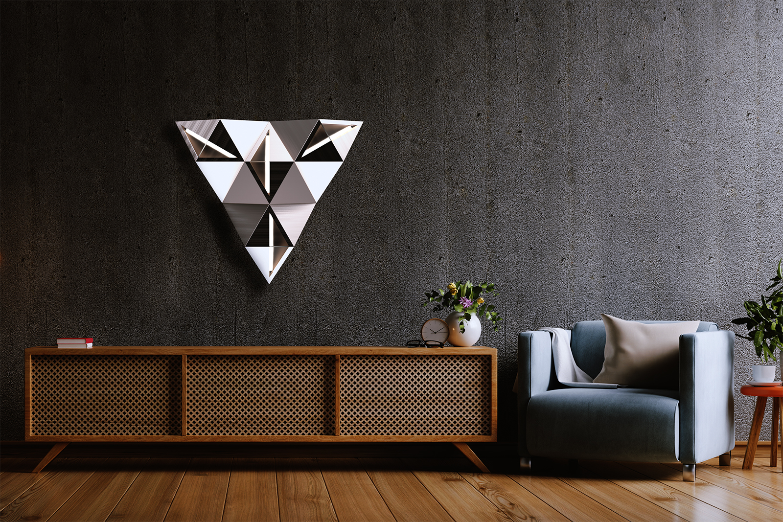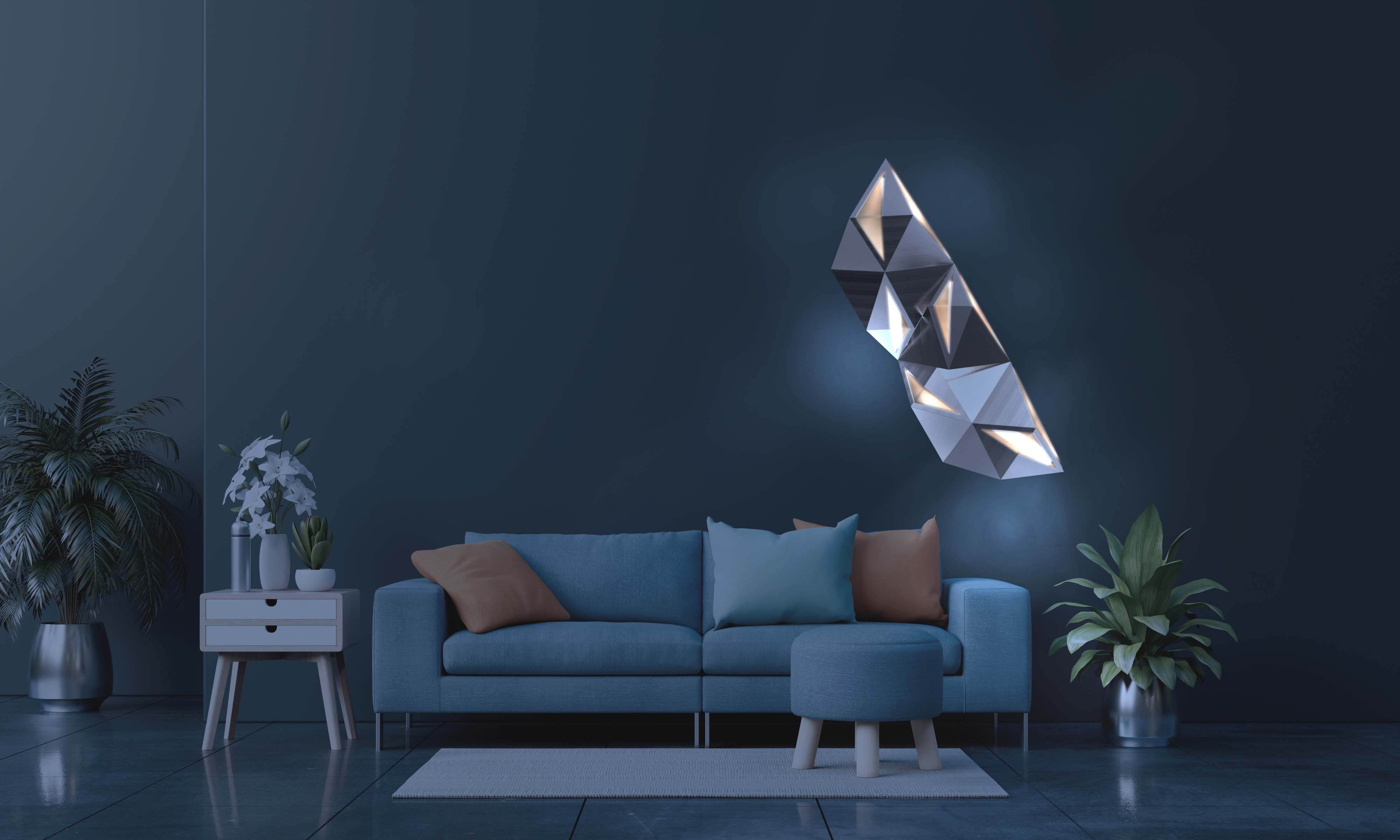Cluster is a modular lighting family that takes inspiration from geodesic structures. The family consists of three different triangular lights that can be placed in various configurations to create unique and visually stunning lighting displays. Constructed from folded brushed steel sheet and frosted acrylic panels, the Cluster family of lights offers both durability and elegance. Whether used individually or combined, the Cluster lights provide a versatile and contemporary lighting solution.