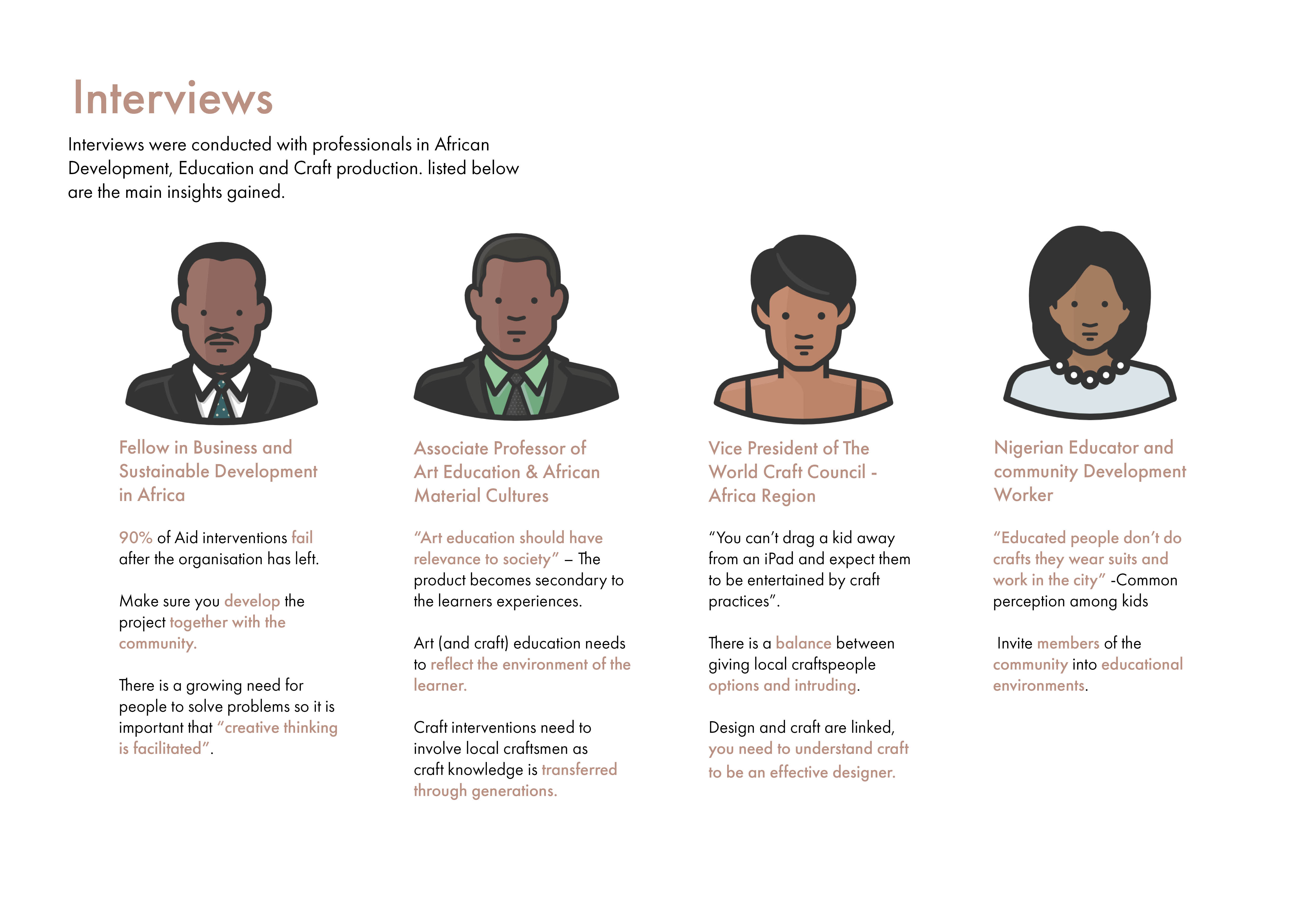 The project utilised a range of primary and secondary research methods to gather data. The primary research involved an extensive review of academic journals, podcasts, books, and magazines related to the area of research, which provided a foundational understanding of the subject matter. This knowledge informed the secondary research, which consisted of interviews with professionals working in Sustainable development, African material culture, Handicrafts, and Education. Additionally, a photo-study was conducted at an African craft retailer, to gain a tactile understanding of the project’s potential outputs.